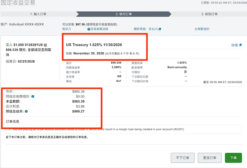 系统会根据输入的金额上限和债券的价格,计算实际需要花费的金额。检查到期日期、收益是否符合预期,确认无误提交订单。
